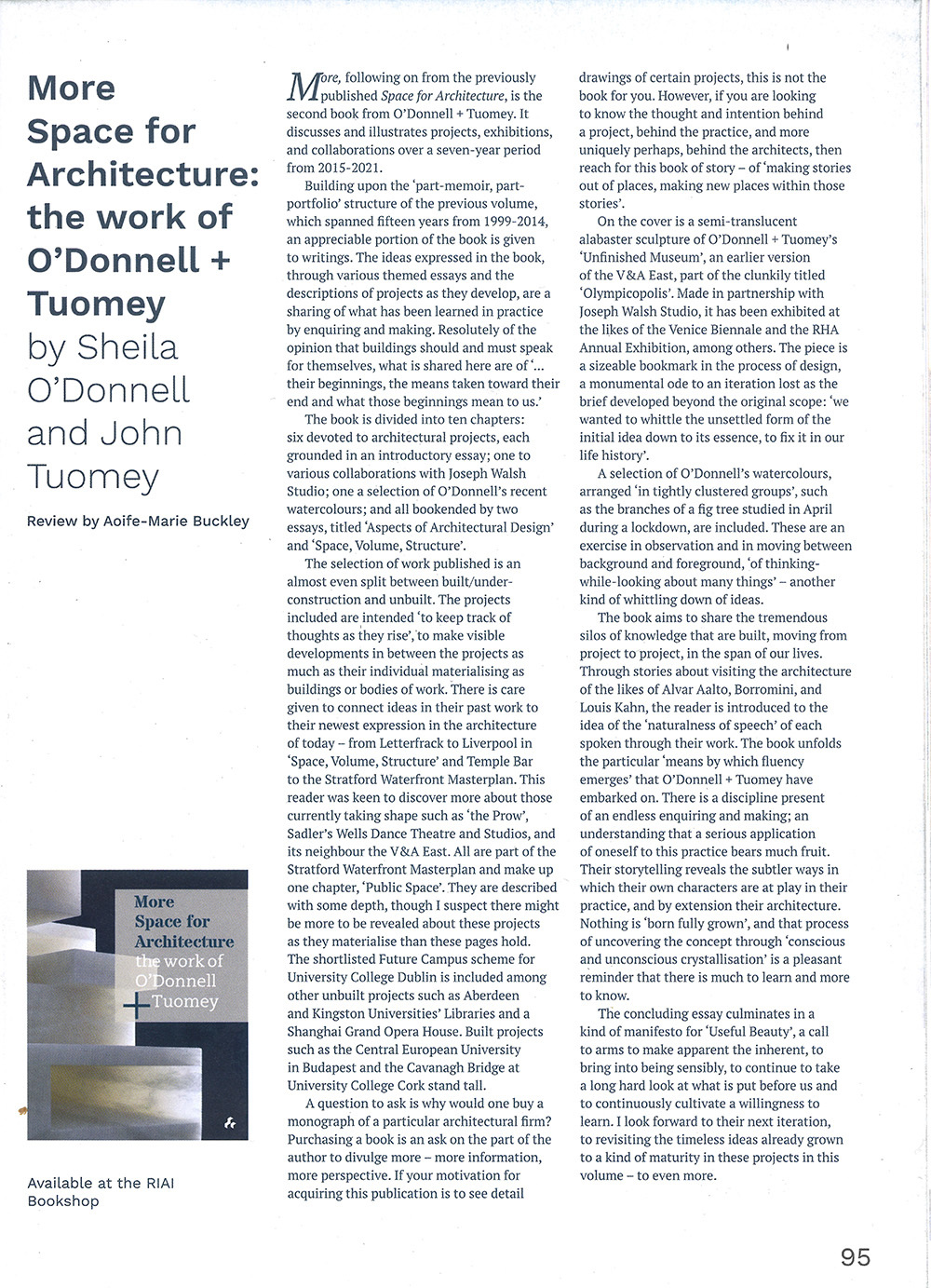 “More Space for Architecture: the work of O’Donnell + Tuomey, by Sheila O’Donnell and John Tuomey, Book Review”, Architecture Ireland, Nov/Dec 2022, Issue 326, RIAI Publication, p. 97.